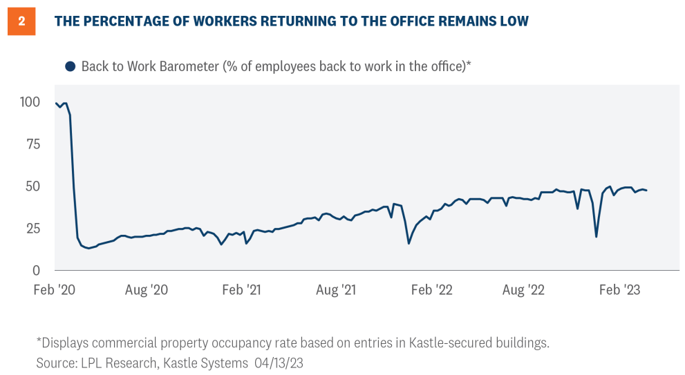 The Back to Work Barometer shown in Figure 2 shows the weekly occupancy rate based on data from Kastle Access Control Systems. The data includes app, keycard, and fob usage for 2,600 buildings and 41,000 businesses across 47 states. While the trend of employees returning back to the physical office is improving, the percentage remains well below prepandemic levels.