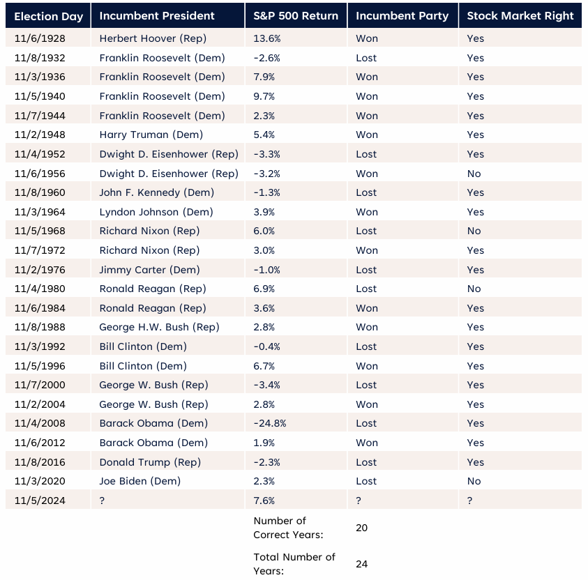 It’s hard to mention policy and the election without referencing one of the stock market’s more popular and accurate election predictors. Historically, the stock market has been a surprisingly accurate and unbiased election forecaster. Since 1928, if the S&P 500 was positive in the three months leading up to an election, the incumbent party remained in control of the White House 80% of the time (12 of 15 elections). Conversely, a declining market in the same period usually signaled a loss for the incumbent —occurring in eight of the last nine elections.