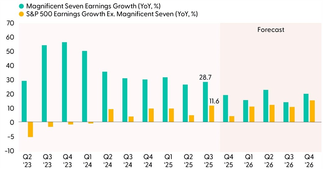The AI frenzy is being reflected in analysts’ expectations for double-digit earnings growth for S&P 500 companies overall both this year and next. The Magnificent Seven has been responsible for more than half of S&P 500 earnings growth the past few quarters and will likely continue to play a significant role in growing earnings in 2026. While the wide gap between the Magnificent Seven’s earnings growth and the rest of the market will likely persist well into 2026, supporting large cap growth stocks, expect this gap to narrow as the year progresses. This is something to watch closely when the calendar turns, as it could spark a market rotation into value stocks.