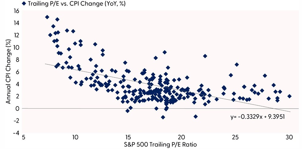 High valuations are another reason we suggest investors be careful and not take on too much risk. As shown in the “High Inflation Tends to Pressure Stock Valuations” chart, higher inflation tends to be accompanied by lower valuations, and vice versa. Based on this analysis, a 4% inflation rate, which is where high tariffs could potentially take us, would imply a price-to-earnings ratio (P/E) of around 16 times trailing earnings. With the trailing P/E currently at 23, that suggests hefty downside risk. Even as a bear case, we think that’s too bearish.